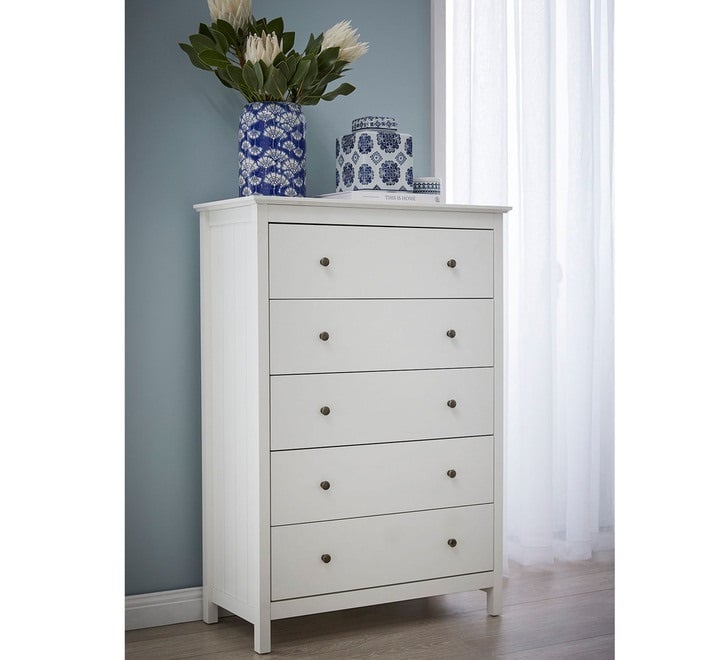 Complete your bedroom with the matching Tallboy, featuring 5 spacious drawers on easy glide runners, you’ll never run out of space with the Hamilton 5 Drawer Tallboy.